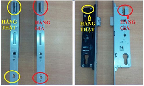 Thân khóa đa điểm hàng giả trên lưỡi gà không có ốc vít để điều chỉnh lưỡi gà, bên cạnh đó các chi tiết rõ ràng như trên vùng khoanh đỏ, vàng đối chiếu giữ hai thân khóa.Hàng giả chữ Kinlong dập trên than khóa mờ nhạt bị lem chữ , cạnh than khóa bén vì không được sử lý chất lượng .Dùng hàng than khóa giả hay bị kẹt khóa , về thời gian sẽ vô tác dụng không đảm bảo được độ an toàn của bộ cửa.