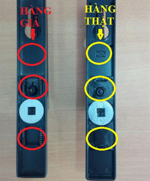 Vị trí khoan tròn: Hàng giả lò xo sẽ lộ ra ngoài mắt có thể nhìn thấy được. Còn hàng thật được có nắp che dập nổi ký hiệu mã hàng